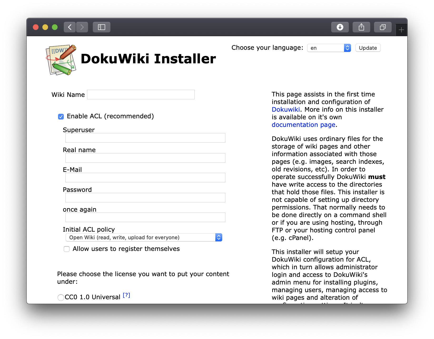 DokuWiki on Unit - Installation Screen
